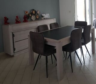 Salle à manger en bois d'oregon, finition brossée. Valeur 3246 € ENFILADE 2 portes 2 tiroirs H 99 x L 220 x P 51 cm Tiroirs avec coulisses métalliques invisibles, systèmes pousse