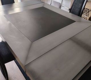 Mobilier fabriqué à Colmar comprenant 1 TABLE ARGENTUM 120 × 120 cm avec 2 Allonges (8 personnes) + 1 Lot de 4 CHAISES Assorties.