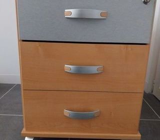 Caisson roulant de bureau en bois clair L43/H58/P58 - Nombre de tiroirs : 3 avec système de fermeture en état de marche - Matériau : Bois clair - Roulettes : Oui Bon état N'h