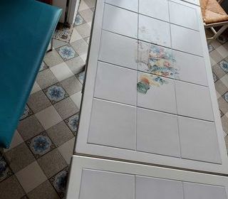 Table de cuisine Carrelage blanc avec motif au centre 1 rallonge de chaque côté Longueur : 69 cm Longueur avec rallonge : 168 cm Hauteur : 78 cm Largeur : 109,5 cm 2 chai