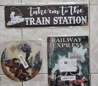 Plaque en métal train à vapeur:Dimensions:40x10 cm Plaque métal Locomotive :Diamètre :20 cm Le prix est pour les trois plaques
