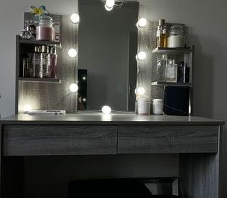 Bonjour, Je vends cette superbe coiffeuse en bois gris texturé, très bon état. Parfaite pour une chambre ou un coin beauté. ?Caractéristiques : ?Dimensions : L 96 cm x H 131 cm