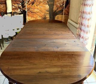 vendons 1 table bois brut de famille, 6 pieds, (117 x 130cm diametre) avec ses 4 rallonges (33 x 130cm) l'ensemble rénové la table est vernie, les rallonges non. *les