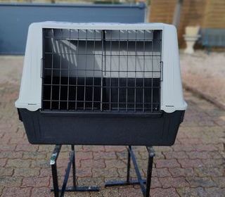 Vends cage de transport pour animaux. Dimensions: L:77 cm l: 48 cm h: 61 cm Deux rangement sur le dessus Très bon état.