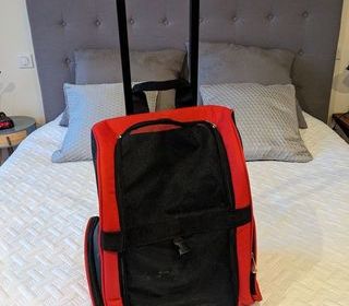 Je vends un sac de transport à roulettes, pour chien jusqu'à 10 kgs, état neuf, qui fait aussi un confortable sac à dos , à venir le prendre sur place