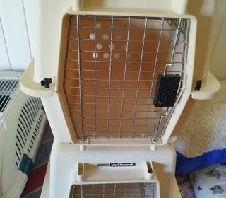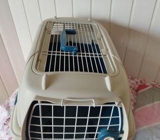 Cage de transport pour chat : S'ouvre sur le dessus, contient une petite trappe sur le dessus de la cage pour faire des caresses a votre animal Propre et en excellent état