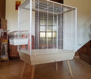 Très grande cage pour rongeurs avec plateau d'alimentation avec 3 gemelles en inox intégrées et tiroir de fond coulissant avec bac en acier intégré. Munie de 4 roulettes antidérapa