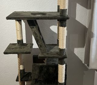 Je vends ce grand arbre à chat de couleur verte, avec plusieurs plateformes, 2 niches et des poteaux griffoires. Il mesure 1m80 de hauteur. L'un des petits griffoirs est abimé mai