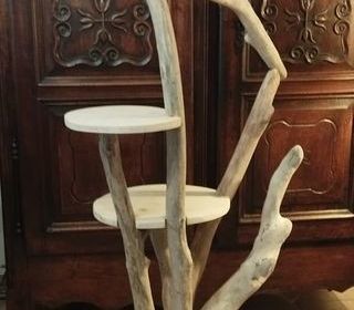 arbre à chat réalisé en bois flotté de mer. Socle en bois massif. 4 plateaux. hauteur : 1.49 m. largeur : 0.66 m.