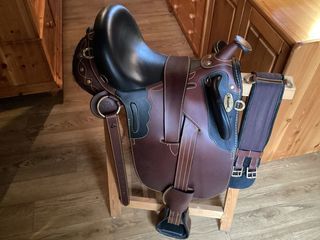 Selle Stock Excelior surpiquée à pommeau. Taille 17. Selle bicolore en cuir de buffle.Siège creux avec coussin doublé et siège large troussequin. Plusieurs anneaux de fixations.Com