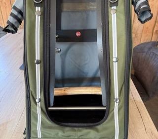 En très bon état et de très bonne qualité. Sac à dos adapté pour nos animaux à plumes. Taille pour gris du Gabon, amazone et cacatoès. Perchoir réglable en hauteur, les protections