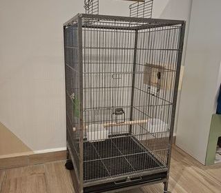Je vends cette cage à roulettes, pour oiseaux ou 1 oiseau eam pouvant se libérer dans une pièce. Nous avons dû couper la cage pour mettre 1 nid j'en fourni donc un neuf avec, celui