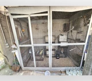 Grande volière exterieure, 104x180, avec les dalles béton. Présence de rouille, j'ai donc mis des renforts en acier inoxydable. J'ai également ajouté une grande porte pour faci