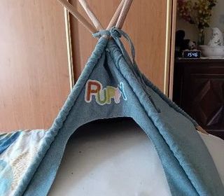 Vends Teepee bleu ciel, pour chat ou petit chien. Dimensions : Teepee : 52 x 52 ! Coussin 47 x 47 Le coussin est recouvert d'une taie zippée, lavable en machine. Etat neuf ! N