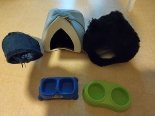 Vends différents accessoires pour chat ? ou petit chien ? ! Un jolie panier tipi gris confortable ! Un jolie panier noir avec 2 oreilles d'ours , jamais utilisé ! Un jolle tun