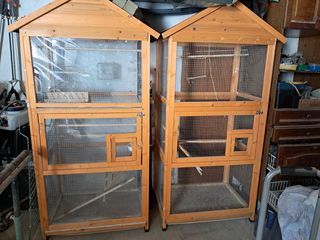 2 cages H=177 cm, l=77 cm et p=55 cm. Grande porte devant et une petite porte sur le côté. Plateau coulissant dans le bas pour nettoyage. Peuvent être vendues séparément 70 euros