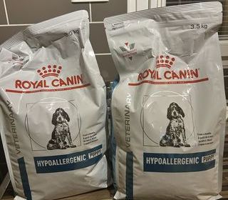 Vend 2 paquets de 3,5kg de croquettes hypoallergenic chiot Royal Canin. Le prix est pour les deux sacs de croquettes. Les paquets sont neufs, cause changement d'alimentation après