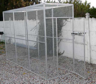 Volière de 5m x 2m x 2m de haut en alu et grillage galvanisé en maille 25 x 25, fil de 2,05 porte avec plateau pivotant 3 bols l Pour moyen et gros perroquets