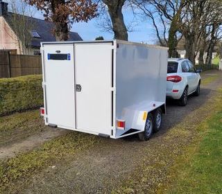 Remorque fourgon avec carte grise PV 550 Kgs PTC 1200 Kgs Dimensions interieures Longueur 280 cm + 30 cm (pointe) Largeur 150 cm Hauteur 150 cm Entièrement reconditionnée Peinture