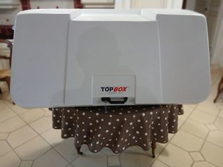Vends Top Box CARRY ALL. Très bonne état, avec ses 2 clés son filet de protection à l'intérieur et ses fixations. Matière ABS, blanc, profondeur 0,53, larg. 1,45, haut.0,70, profon
