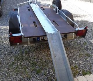 Remorque moto / vélo , pratiquement neuve , planche bois 18mm ,roue jockey , roue de secours , galerie , basculante pour un chargement aisé , béquille at , rampe , feux de gabarit