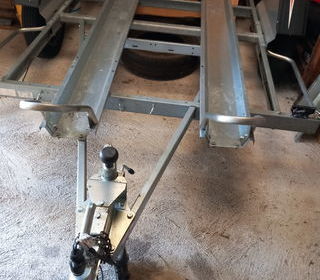 Remorque moto 350 kg non freinée, configurée actuellement en 3 roues, mais facilement modifiable en 2 roues, avec plateau en contre-plaqué marine sur toute la surface. Elle a 2 cof