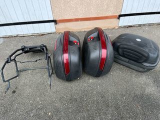 Trois valises GIVI V44 (contenance 2 casques) et un support valises pour FJR 1300. Le tout 190€ L'ensemble peut être vendu séparément : - chaque valise 60€ - le support complet 30€