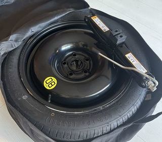 À vendre : roue de secours galette d'origine Volkswagen (compatible Golf 6, 7, 8, Touran) en 17 pouces, jamais utilisée. Elle est livrée avec le cric spécifique, la clé, et la hous