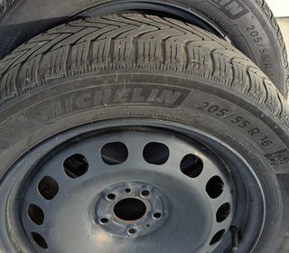 4 pneus neige sur jantes Michelin Alpin 205/55 R16 sur jantes 5 trous ; JTE 6.5 X 16 5T 98 ET 39 58 monté sur une Fiat Tipo , une paire usée et la seconde paire 50% . Les 4 pneus p