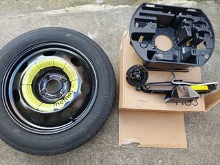Je vends cette roue de secours complète pour Citroën C3 et groupe PSA, livrée avec tous ses accessoires d'installation. Parfait pour avoir un équipement de remplacement neuf et fia