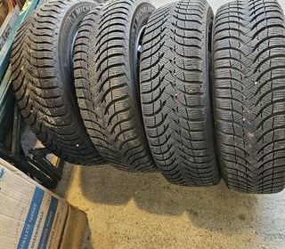 4 pneus Michelin Alpin 175/65 R15 88H montés sur 4 jantes tôle avec 4 trous (5Jx15H2) Ils sont en très bon état et la profondeur des sculptures est encore de 6mm. Donne avec les éc