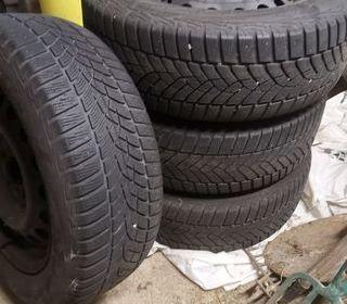 Vends 4 roues complètes, jantes acier 5 trous, équipées de pneus neige servis deux hivers 215 60 R16