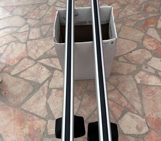 Barres de toit en aluminium avec lames supérieures en caoutchouc. Avec glissière et profil en T pour une installation facile des accessoires (port vélos, porte skis...) Capacité d