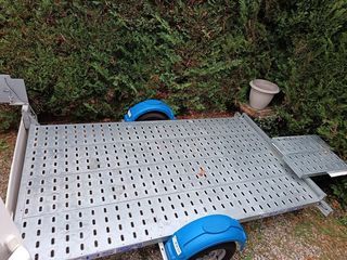 Remorque plateau cbs Q 770 essieu freiné PTAC 1060 kgs poid 290 kgs charge utile 770 kgs plateau basculent et rampes roue de secours et roue jockey carte grise à jour longueur hors