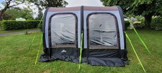 Profondeur : 300 Longueur : 320 Hauteur : 240-280 Papis de sol ,bavette, pompe, 2 barres de toit et rideaux. Auvant ayant servi 3 fois.