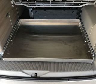 Tiroir en aluminium pour coffre arrière du VW California T5 T6 Glissières télescopique charge lourde, capacité 200 kg. L'ensemble est accroché sur les rails d'origine du plancher d