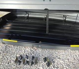 Coffre de toit, dimension L :150cm l :100 cm environs. bon état, fournis avec les 4 fixations pour barres de toit et un jeu de deux clefs. Verins HS. A venir récupérer sur place