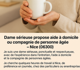 > Je suis une dame sérieuse, ponctuelle et respectueuse, avec de l'expérience dans l'entretien, l'aide à domicile et la compagnie de personnes âgées. Je cherche quelques heure