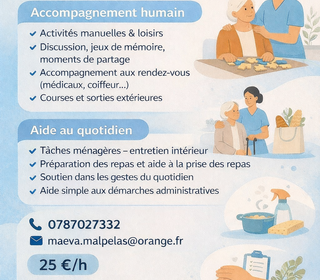 Je suis auxiliaire de vie avec une longue expérience auprès des personnes âgées et handicapées. Je propose mes services pour le maintien à domicile ce qui englobe l'hygiène, la pr