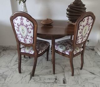 Suite changement de style je vends une table ronde 1.30 m en noyer massif se transformant en console ou demi lune et ses 4 chaises assorties