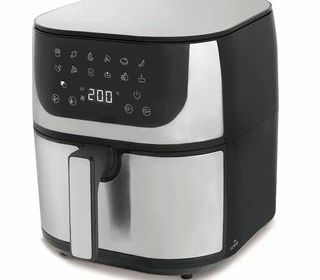 Friteuse sans huile de couleur noire et argentée, avec écran digital tactile et affichage de la température, boutons de commande en façade et tiroir extractible - 9 L - état neuf