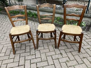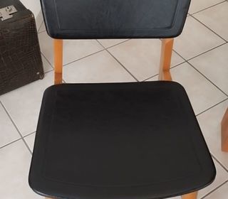A vendre lot de 6 chaises vintage en simili cuir. Noir et bois. Certaines en bon état d'autres sont légèrement abimées (voir photo). Vendues en l'état. Aucune reprise. A récupére