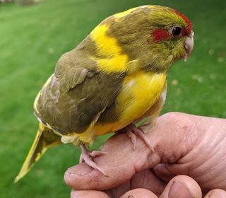 une femelle panachée baguée 2025 a du mal à voler, bien pour une cage en intérieur non apprivoisée mais pourra le devenir avec de la patience du fait qu'elle ne vole pas correcte