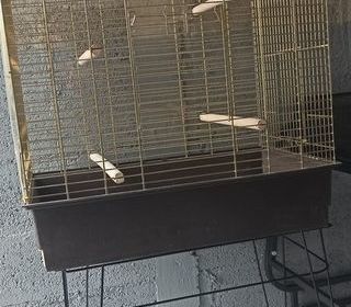 Jolie cage oiseaux pour becs crochus, dorée avec perchoirs, mangeoires... plateau de nettoyage amovible et ouverture sur le dessus pour faire perchoir, vendu avec un bac supplément