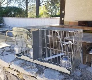 Cage rsl elevage 60x30 mm avec 2 grilles de sol tiroirs perchoirs et mangeoires Etat moyen Divisible en deux cages