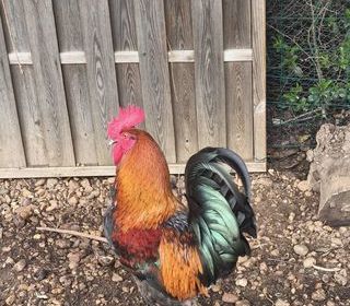 Vends très beau coq aux belles couleurs. Élèv? aux grains et aux restes de repas. Pacifique et élégant.