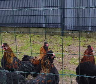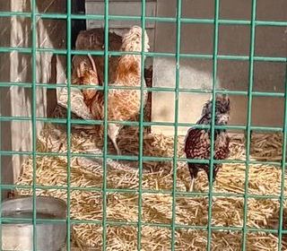 coq doré de 2 ou 3 ans je n'ai pas de poules de sa taille donc il est seul et se trouve au milieu de coqs brahmas et wyandotte sms