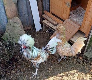 Jeune coq Hollandais Huppé tricolore. Âge de cinq mois. Grande taille. Poule padoue âge de six mois. Grande taille. Ont était traité.