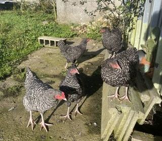 A vendre 4 poules et 1 coq Coucou de Rennes, non croisés, non consanguins. Nés début mai 2025. Pour élevage, oeufs ou chair. 15€ la poule, 10€ le coq