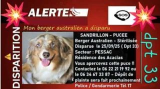 Recherche Sandion cet sauvé à Pessac 33 aider nous à la retrouvé , on vous recompensera identifier 25421 disparu rue du serpent à pessac 33600 couleur merle rouge , yeux bleu c